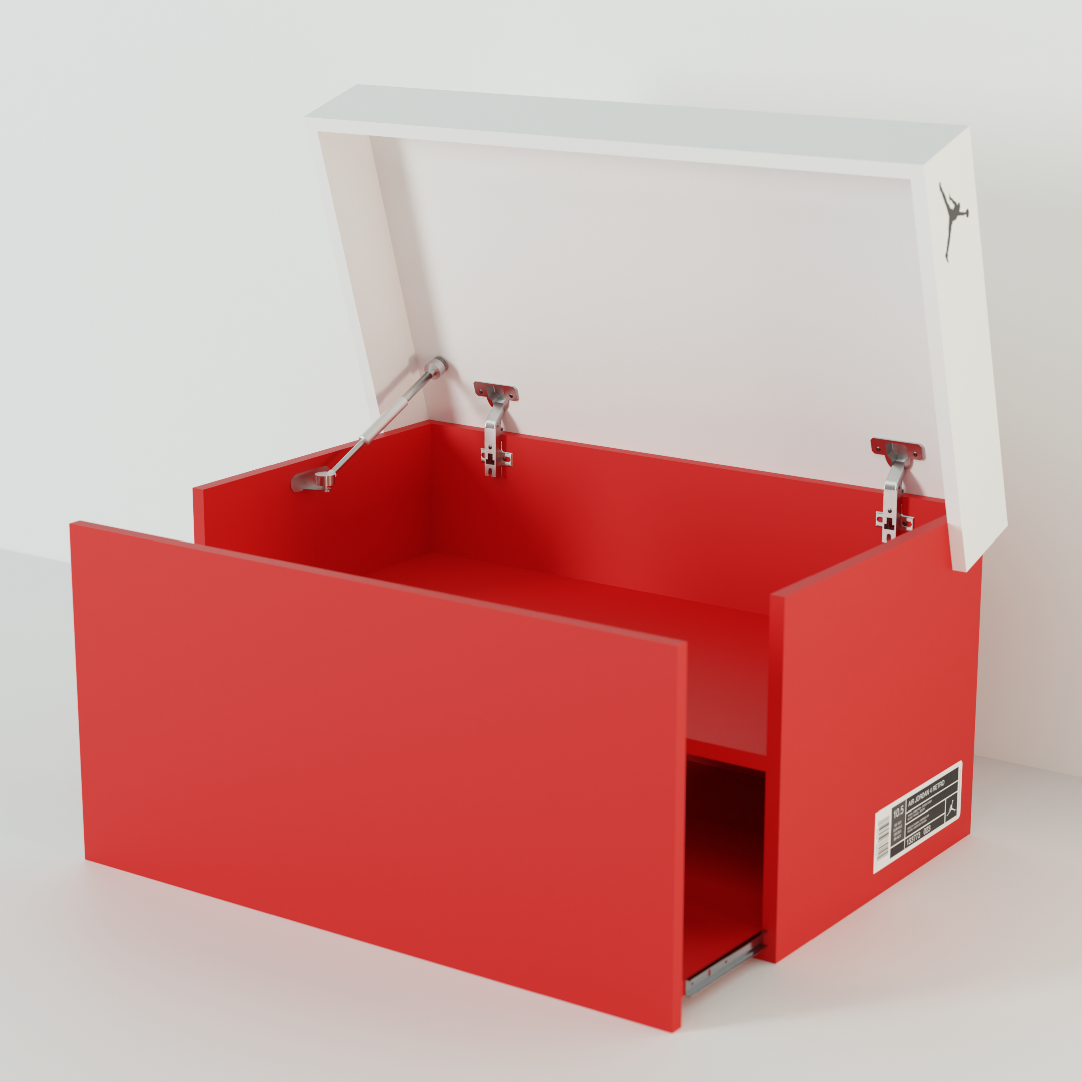 - Sistema de Apertura: Tapa superior con pistón a gas, cajón inferior con correderas telescópicas.